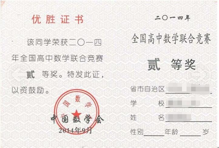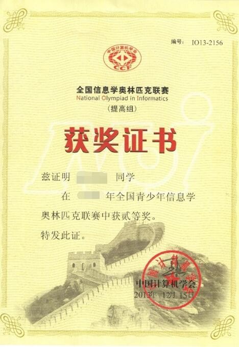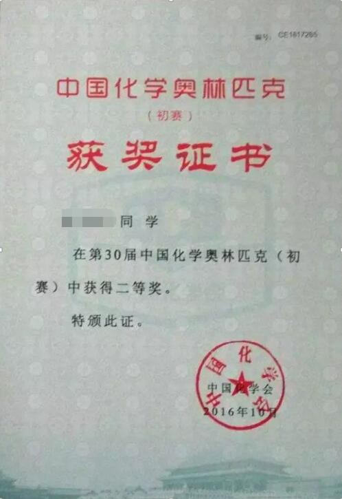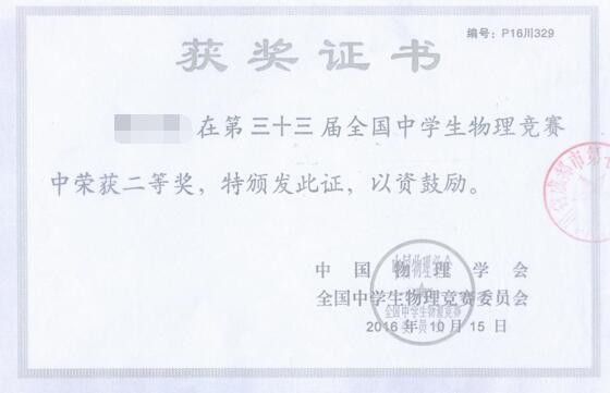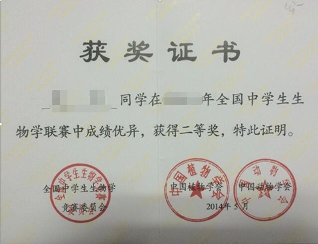 答:全国中学生数学、物理、化学、生物学、信息学奥林匹克学科竞赛获省级赛区二等奖,要求获奖证书分别由中国数学会、中国物理学会、中国化学会、中国植物学会及中国动物学会、中国计算机学会加盖公章。具体证书样例如下:
